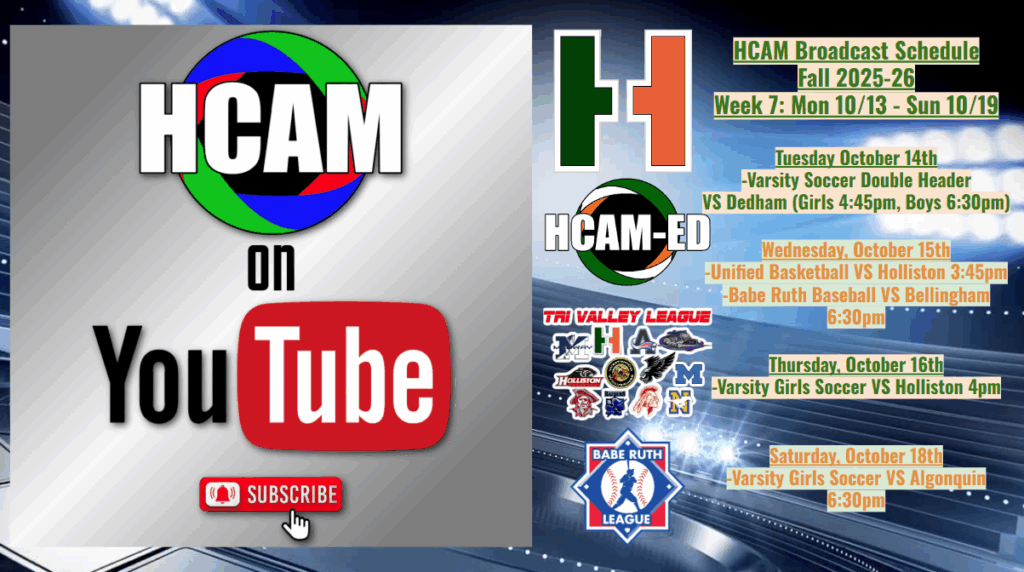 Check out the updated HCAM Hopkinton Hillers broadcast schedule below. (Schedule or links are subject to change at anytime.) Check this page for any changes! View the latest highlights from Week 6 HERE!
