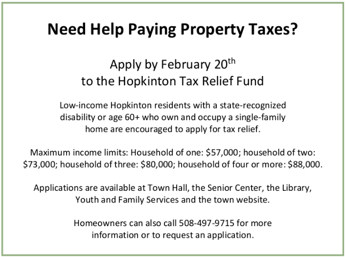 Apply by February 20th to the Hopkinton Tax Relief Committee, View more details below!
