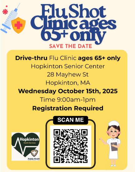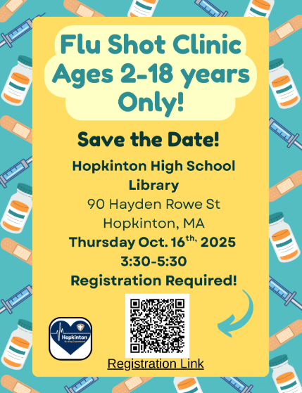Hopkinton Health Services are pleased to offer the following flu vaccine clinics open to all residents in the MetroWest Region. These clinics are made possible by a grant from the MetroWest Health Foundation to improve adult vaccine access, and reflect our ongoing commitment to the Massachusetts Department of Public Health’s vision for universal vaccine access for children within the Commonwealth.