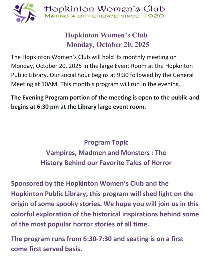 Hopkinton Women’s Club Annual Meeting: Monday, October 20th 2025By Contributor / October 7, 2025 Hopkinton Women’s Club Annual Meeting on Monday, October 20th 2025