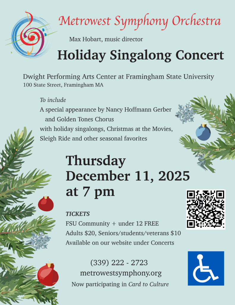 Tickets are Adults $20; Seniors/veterans/students $10; FSU Community + under 12 FREE. To purchase tickets, visit https://www.metrowestsymphony.org/concerts or call (339) 222-2723 or email info@metrowestsymphony.org.