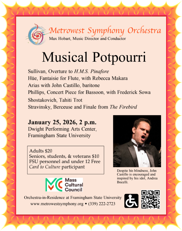 The Metrowest Symphony Orchestra, under the direction of Max Hobart, will present Musical Potpourri, a concert with something for everyone! The concert will include music by Sir Arthur Sullivan, opera arias with baritone John Castillo, and the finale from Stravinsky’s The Firebird. MSO will also feature two of our accomplished woodwind soloists, Rebecca Makara on flute and Frederick Sowa on bassoon. Get your tickets today!